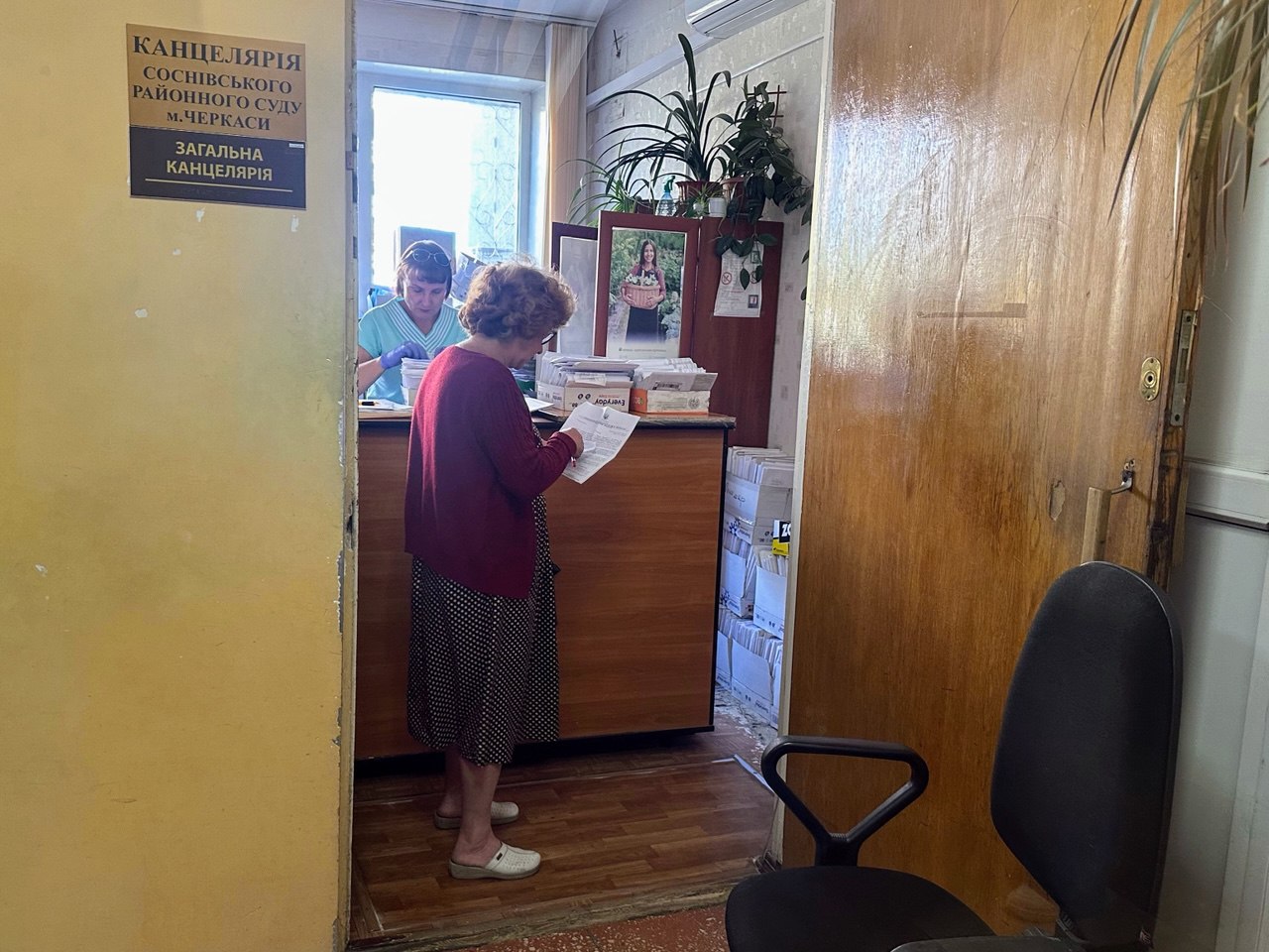 Катерина Ведмідь, керівник апарату Соснівського районного суду м. Черкаси: «УСоснівському районному суді міста Черкаси працюють 84 працівника, з них — 15 суддів. Враховуючи те, що справ розглядається багато і судді засідають щодня — кількості залів судових засідань, а їх 4 — недостатньо. Через те, що площі на всіх не вистачає, судді працюють в кабінетах разом з помічниками, секретарями або всі разом. Також бракує місця в апараті суду. До прикладу, в одному кабінеті розміщуються 10 працівників.